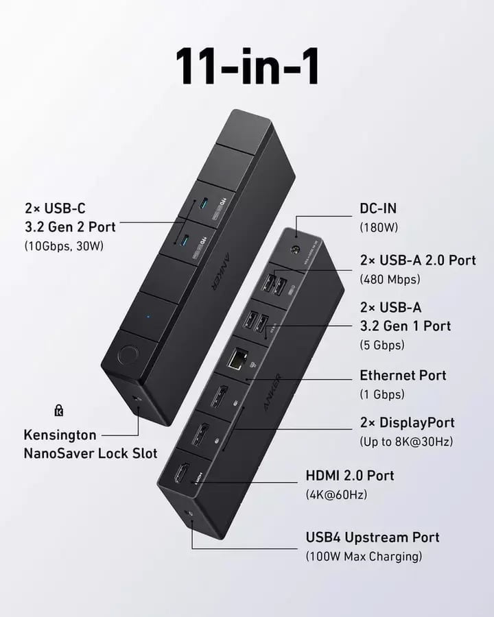11-in-1, docking station ini lengkap dengan 11 konektor. Ada 3 port yang mendukung Power Delivery, yaitu satu port USB4 100W dan dua USB 3.2 Gen 2 Type-C 30W. Hal ini memungkinkan pengguna dapat mengisi laptop, smartphone dan tablet sekaligus.