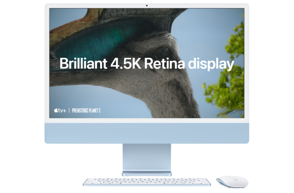 Tampilan: iMac baru ini memiliki layar 4.5K Retina berukuran 24 inci dengan LED-backlit dan kecerahan 500 nits. Layar ini mendukung Wi-Fi 6E, Bluetooth 5.3, dan integrasi yang mulus dengan iPhone. Kamera FaceTime HD 1080p berguna untuk konferensi video, memiliki sistem speaker enam speaker dan mikrofon tiga arah dengan drectional beamforming.
