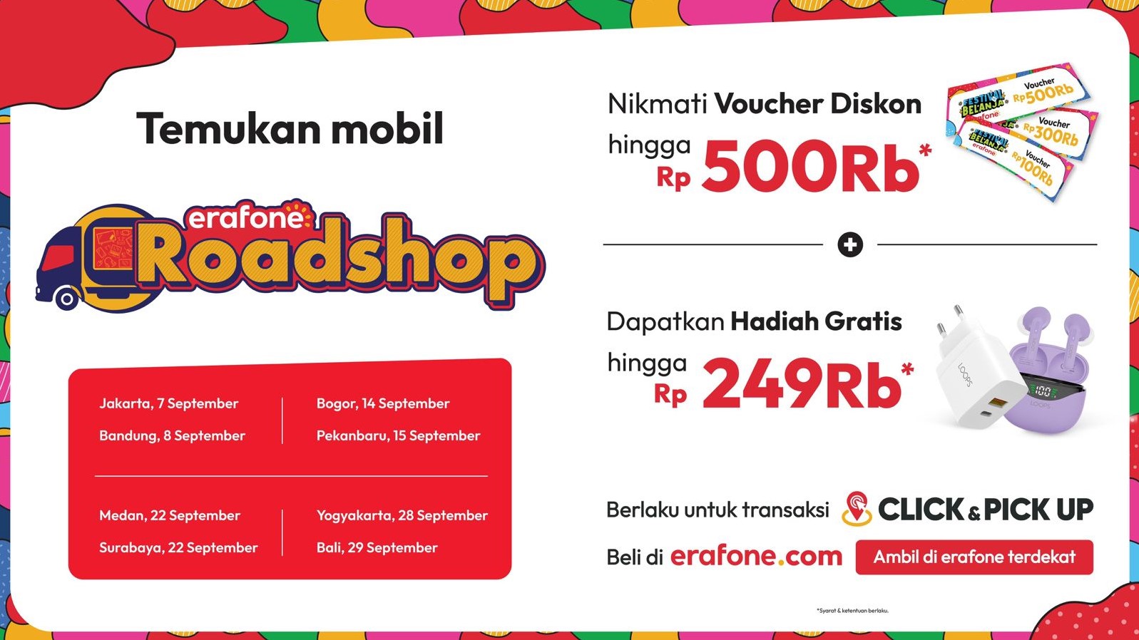 Pelanggan yang berpartisipasi dalam program Click & Pickup di acara erafone Roadshop berkesempatan mendapatkan voucher diskon hingga Rp500.000 dan hadiah gratis senilai hingga Rp249.000. Sebagai bagian dari kemeriahan Festival Belanja erafone yang berlangsung pada 15 Agustus-30 September 2024, pengunjung juga dapat mengikuti permainan Cari Kata untuk memperebutkan hadiah hiburan menarik.