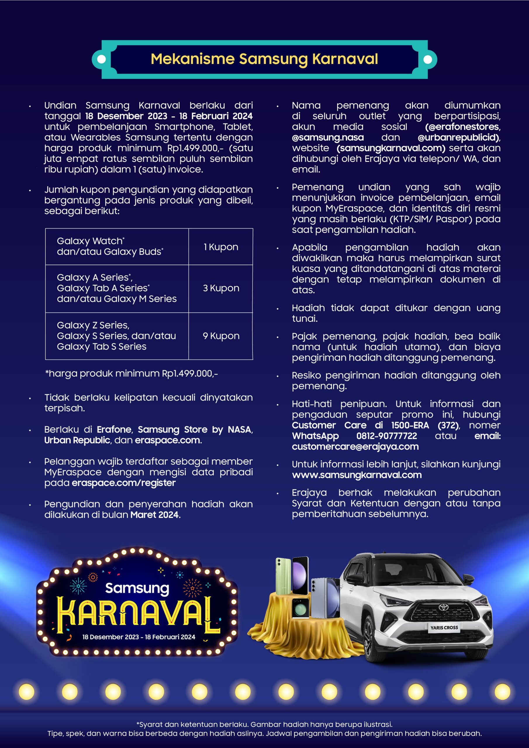 Jumlah kupon undian didapat berdasarkan produk yang pelanggan beli. Pengundian dan pengumuman pemenang akan mereka laksanakan pada bulan Maret 2024. Nama-nama pemenang akan mereka umumkan di gerai, akun media sosial @erafonestores, @samsung.nasa, @urbanrepublicid, serta situs resmi www.samsungkarnaval.com.