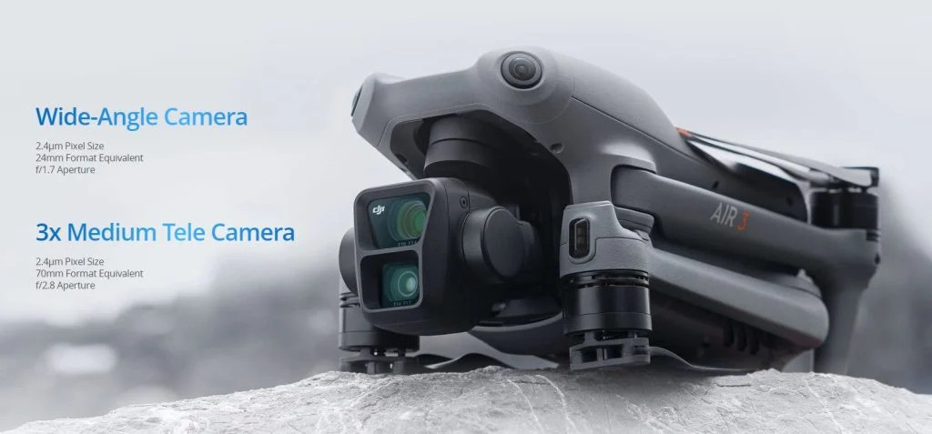 DJI Air 3 memungkinkan penerbang drone mendapatkan kualitas foto dan video yang konsisten saat mengambil gambar dengan sudut lebar maupun medium tele, memberi kebebasan kreatif untuk menghasilkan konten aerial. Drone ini memiliki dua kamera, masing-masing menggunakan sensor yang sama, yaitu CMOS 1/1,3”. Kamera lebar setara 24mm dengan bukaan f1,7, sedangkan kamera medium tele setara 70mm dengan bukaan f2,8. Kamera medium tele memungkinkan 3x optical zoom dan menghasilkan efek spatial compression yang mendekatkan jarak antara subyek dengan latar belakangnya.