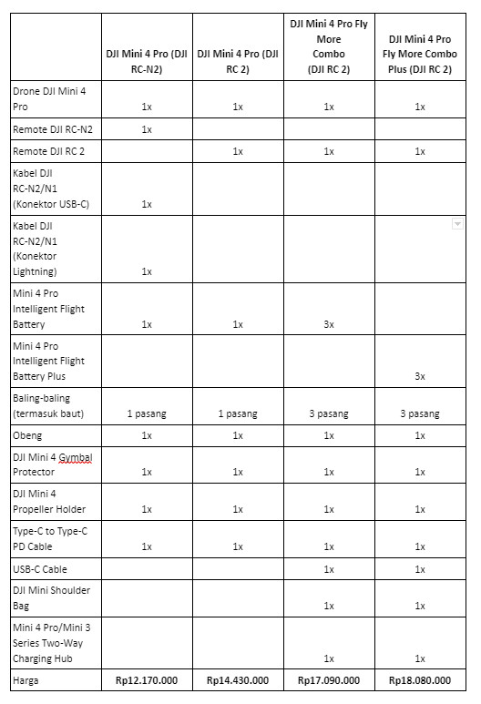 Erajaya Active Lifestyle menghadirkan empat paket pembelian DJI Mini 4 Pro untuk menjawab kebutuhan unik dari setiap penggunanya: Mini 4 Pro (DJI RC-N2), Mini 4 Pro (DJI RC 2), Mini 4 Pro Fly More Combo (DJI RC 2) dan Mini 4 Pro Fly More Combo Plus (DJI RC 2). Berikut rinciannya: