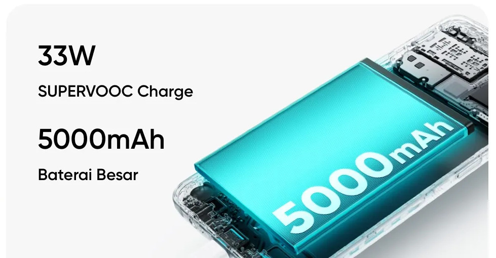 Yang menjadi sorotan realme C51 adalah dukungan pengisian daya baterainya. HP ini memiliki dukungan pengisian daya tercepat 33W SUPERVOOC di segmen harganya.