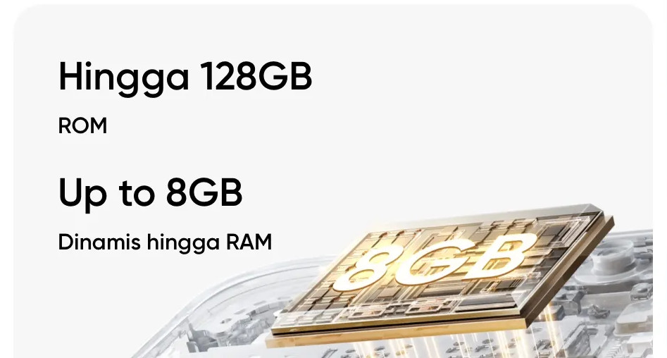 Ponsel yang meluncur bersamaan dengan realme 11 ini memiliki kapasitas penyimpanan terbesar, yaitu 128GB. Faktor ini membuat realme C51 menjadi ponsel dengan penyimpanan internal terbesar di kelas harga sejutaan. Selain itu, untuk meningkatkan performa, ponsel ini memiliki RAM 4GB yang dapat kalian perluas hingga 8GB dengan dukungan Dynamic RAM hingga 4GB. Pengguna juga dapat menambah memori penyimpanan eksternal hingga 2TB.