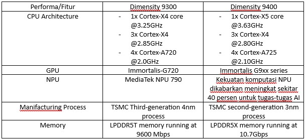 Berikut ini perbandingan antara Dimensity 9300 dan Dimensity 9400:
